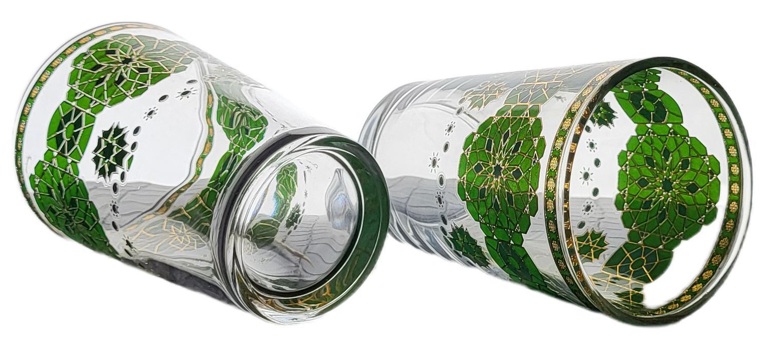 Het glas is rijk gedecoreerd met een diepgroen geometrisch patroon, geïnspireerd op de traditionele Zellij-mozaïeken die kenmerkend zijn voor de Marokkaanse architectuur. De rand aan de bovenzijde geeft het geheel een luxueuze afwerking en een vleugje feestelijke glans.