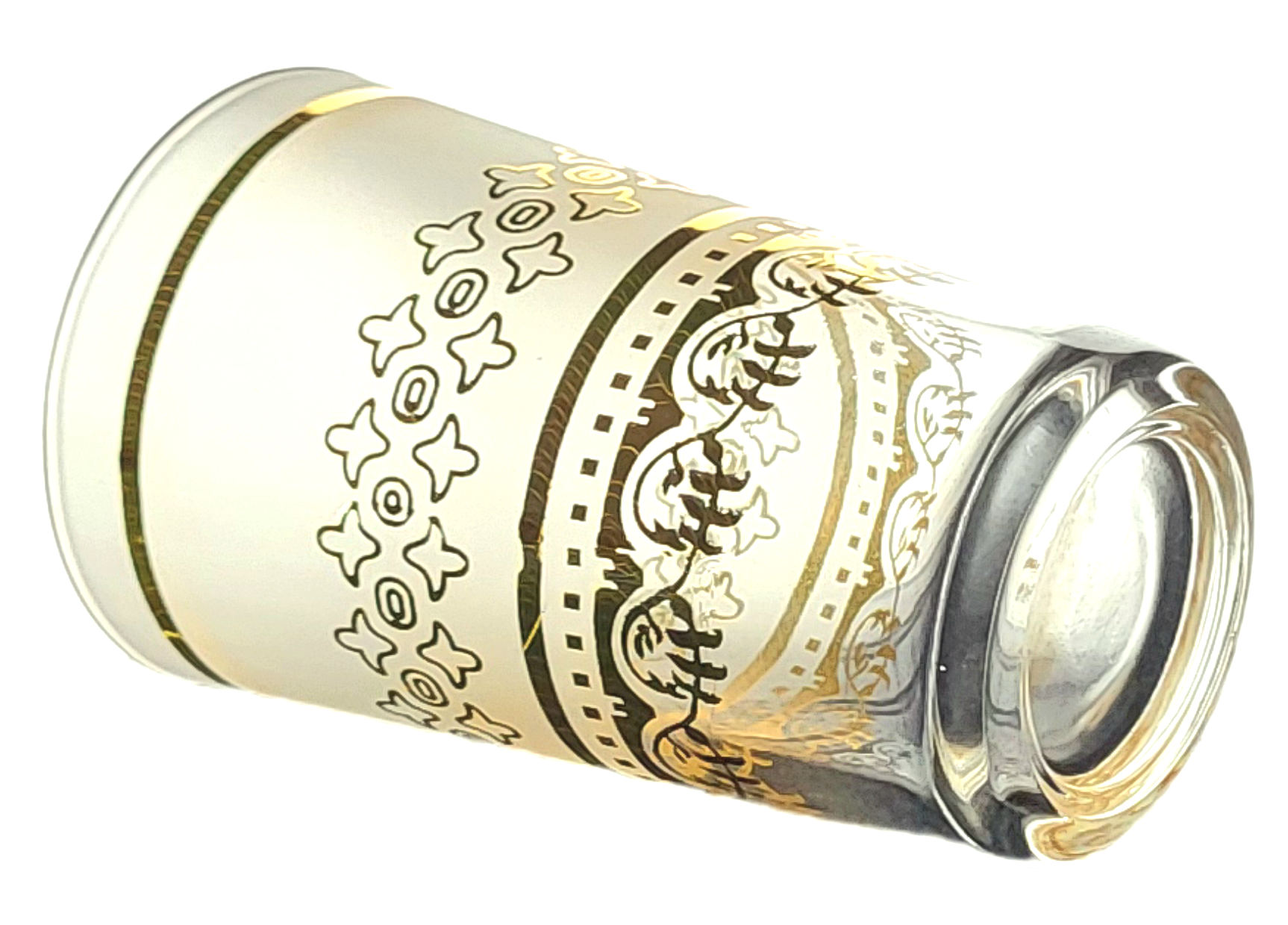 Het glas heeft een transparante basis met een subtiel matwit effect in het bovenste gedeelte. Rondom het glas loopt een prachtig gouden patroon, bestaande uit sierlijke lijnen en motieven. Een fijne gouden rand aan de bovenkant maakt het ontwerp helemaal af en geeft het glas een chique uitstraling.
